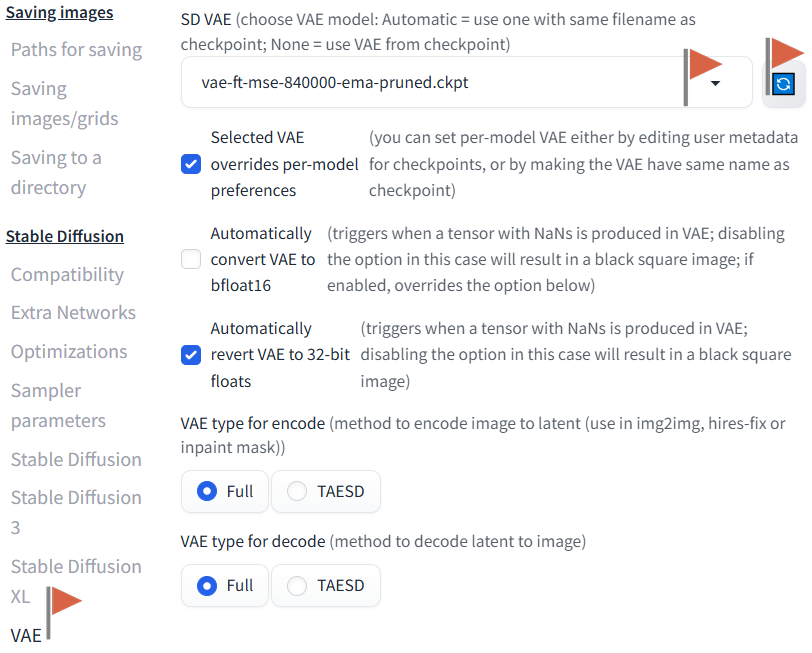 - 다음으로 VAE =>SD VAE (choose VAE model: Automatic = use one with same filename as checkpoint; None = use VAE from checkpoint)를 vae-ft-mse-840000-ema-pruned.ckpt로 변경합니다.