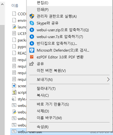 - 설치가 다 끝났다면 위 사진처럼 Webui-user.bat 파일을 오른쪽 클릭 편집을 눌러 줍니다.