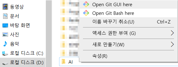 - 설치를 위한 폴더를 선택 마우스 우클릭, Open Git Bash here를 선택