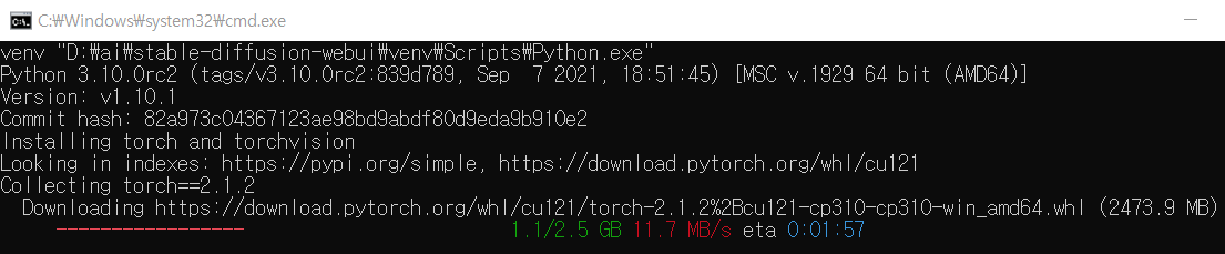 - webui-user.bat를 실행하면 위 처럼 필요한 파일을 자동으로 다운로드 합니다.