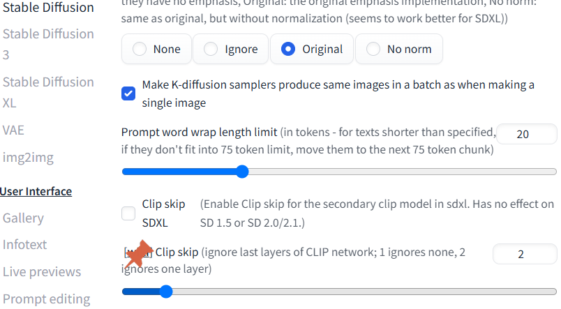 - Stablediffusion -> clip skip 를 2로 값을 변경합니다.
