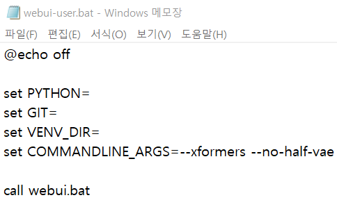 - --xformers --no-half-vae 이 글을 삽입하여 줍니다.